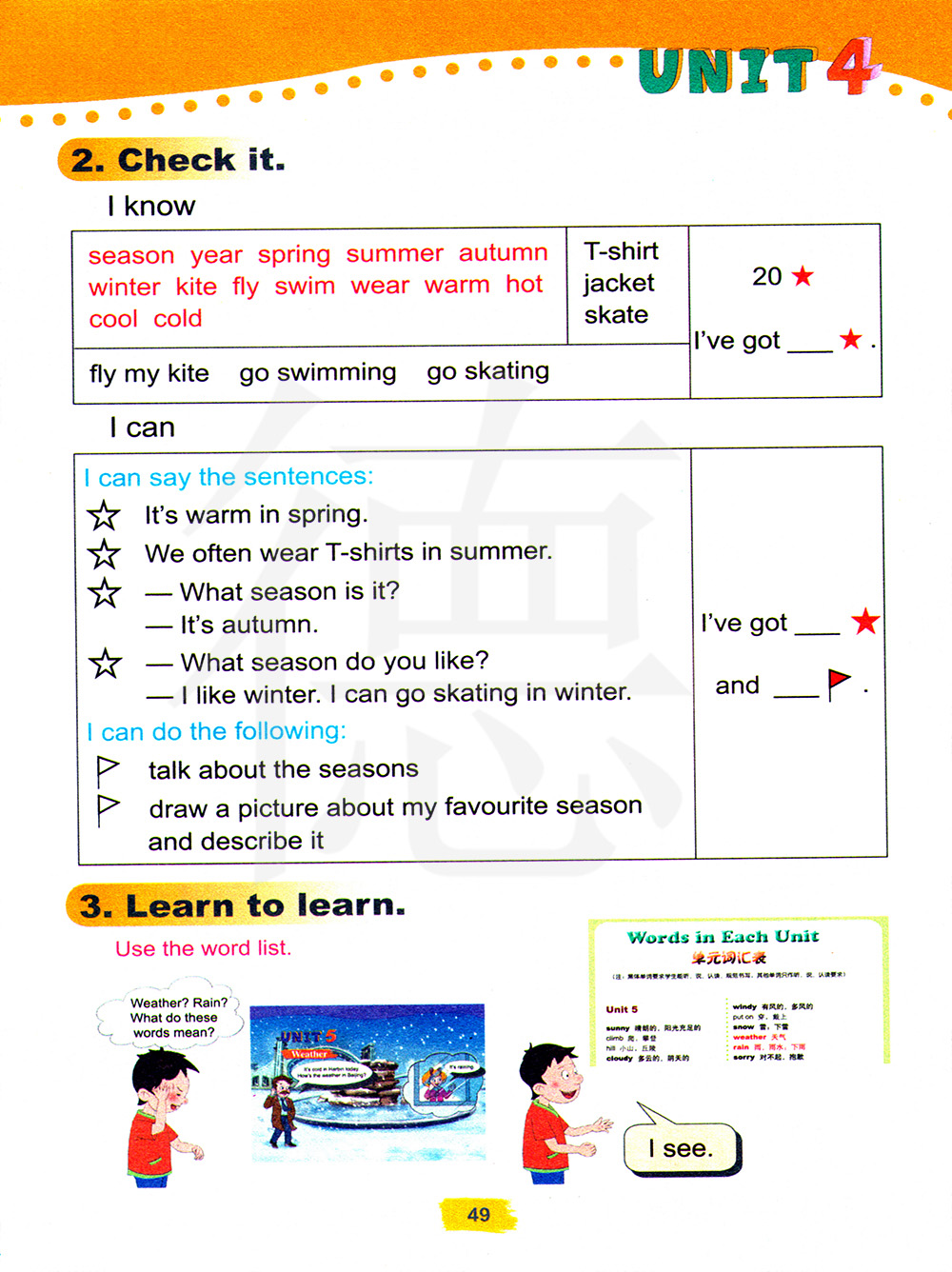 季节 年 春 夏 秋 冬 风筝 飞 游泳 穿 温暖 热 凉爽的 寒冷的
