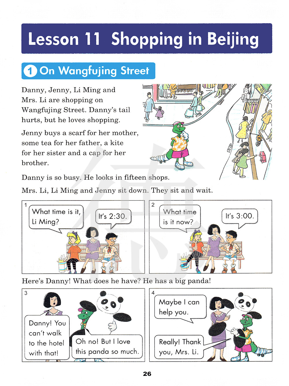 丹尼、詹妮、李明和李太太在王府井大街购物。丹尼的尾巴受伤了,但是他喜欢购物。