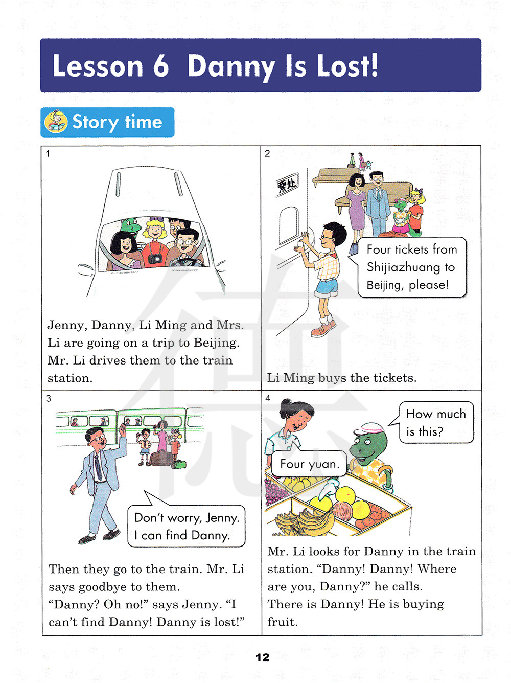 李先生在火车站里找丹尼。“丹尼!丹尼!你在哪里,丹尼?”他喊道。丹尼在这里!他在买水果。