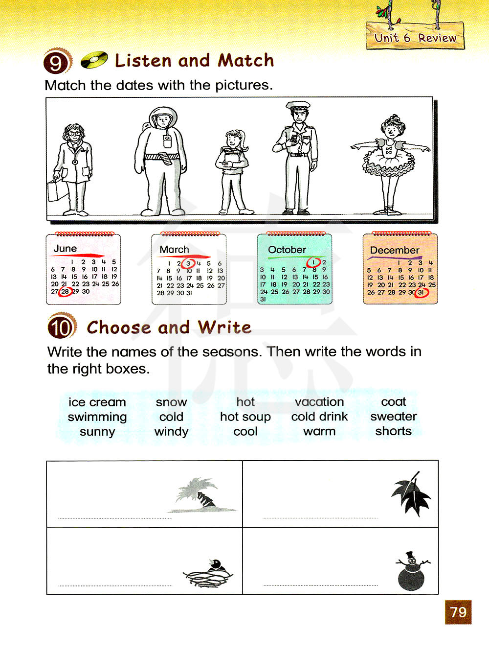 写下季节的名字。然后把单词填进正确的方框中。