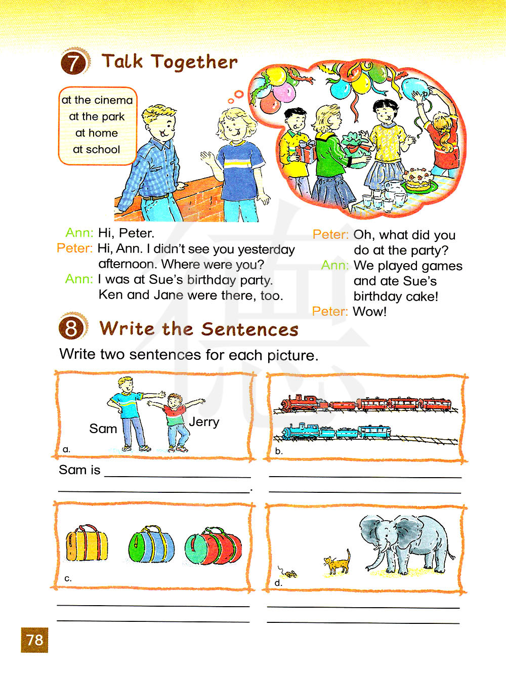 你好,彼特。你好,安。我昨天下午没有见到你。你去哪儿啦!我去了苏的生日聚会。肯和简也在。