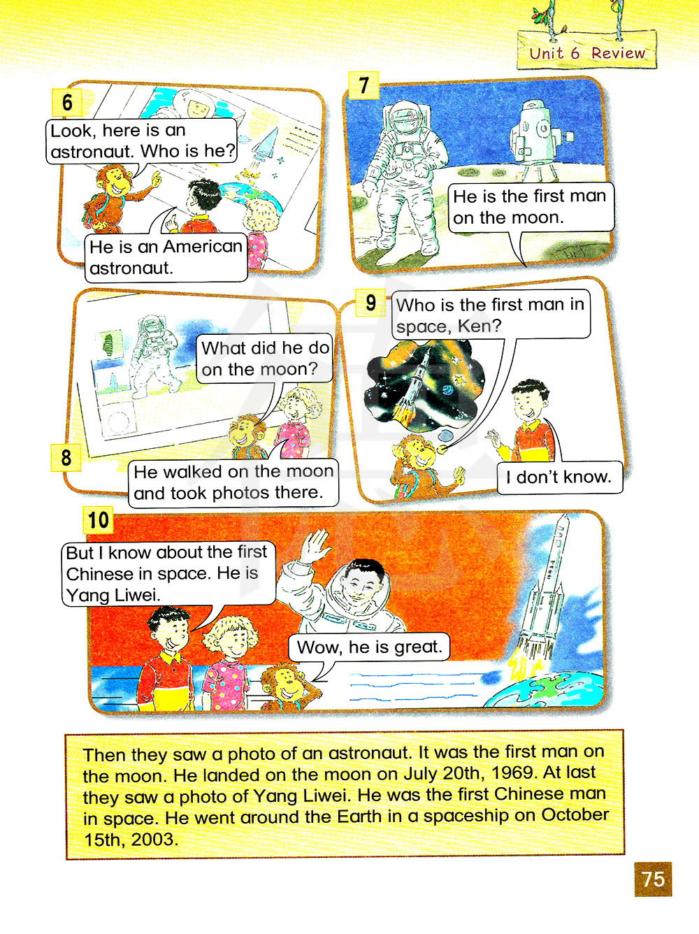 然后他们看到了一名宇航员的照片。这是第一个登上月球的人。1969年7月20日他登上了月球。最后他们看了杨利伟的一张照片。他是第一个进入太空的中国人。2003年10月15日,他坐着宇宙飞船环绕地球。