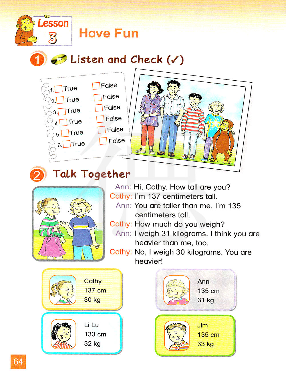 你好,凯茜。你有多高?我有137厘米。 你比我高。我有135厘米。