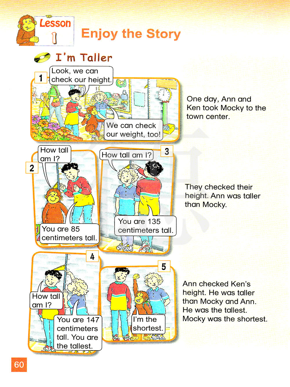 安测量了肯的身高。他比莫奇和安高。 他是最高的。莫奇是最矮的。