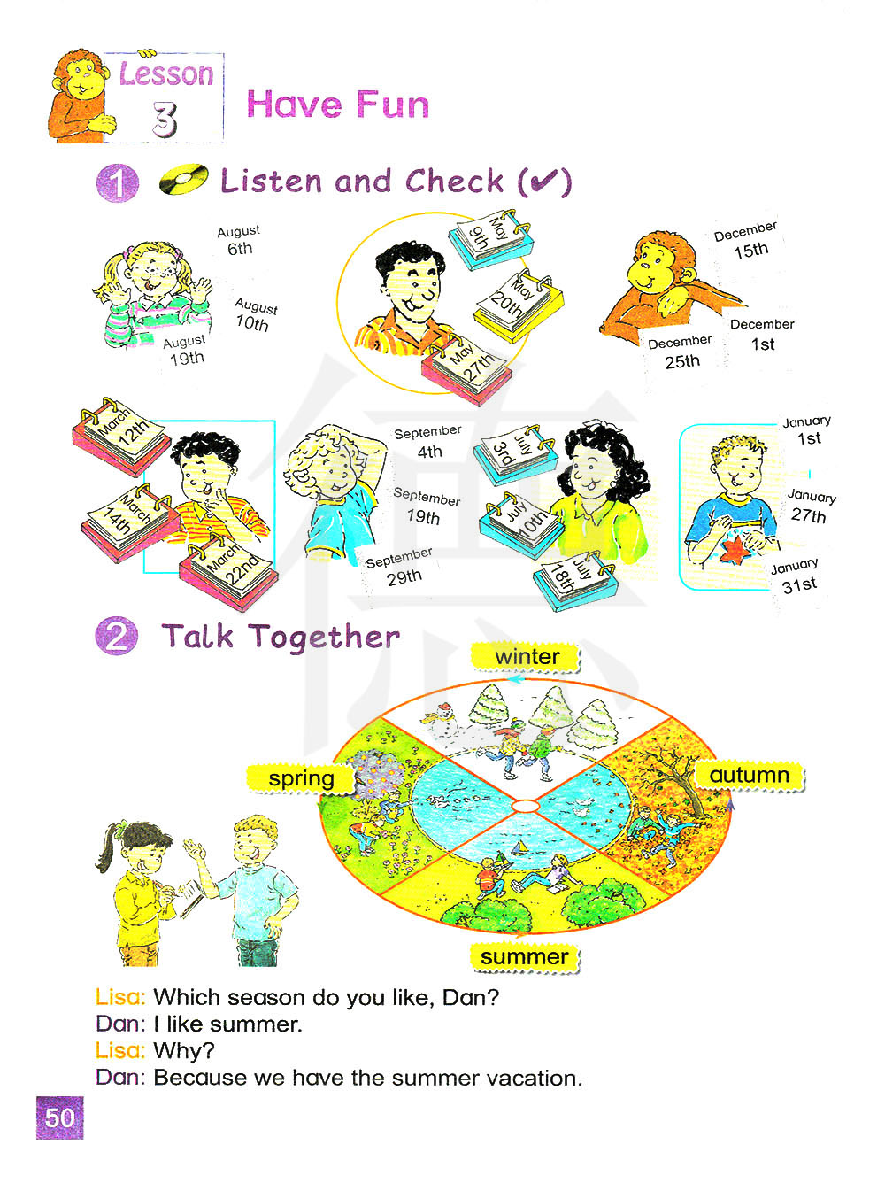 你喜欢哪个季节,丹? 我喜欢夏天。为什么?因为我们有暑假