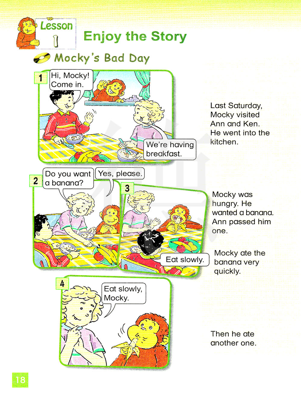 莫奇很饿。他想要一根香蕉。安递给他了一根。