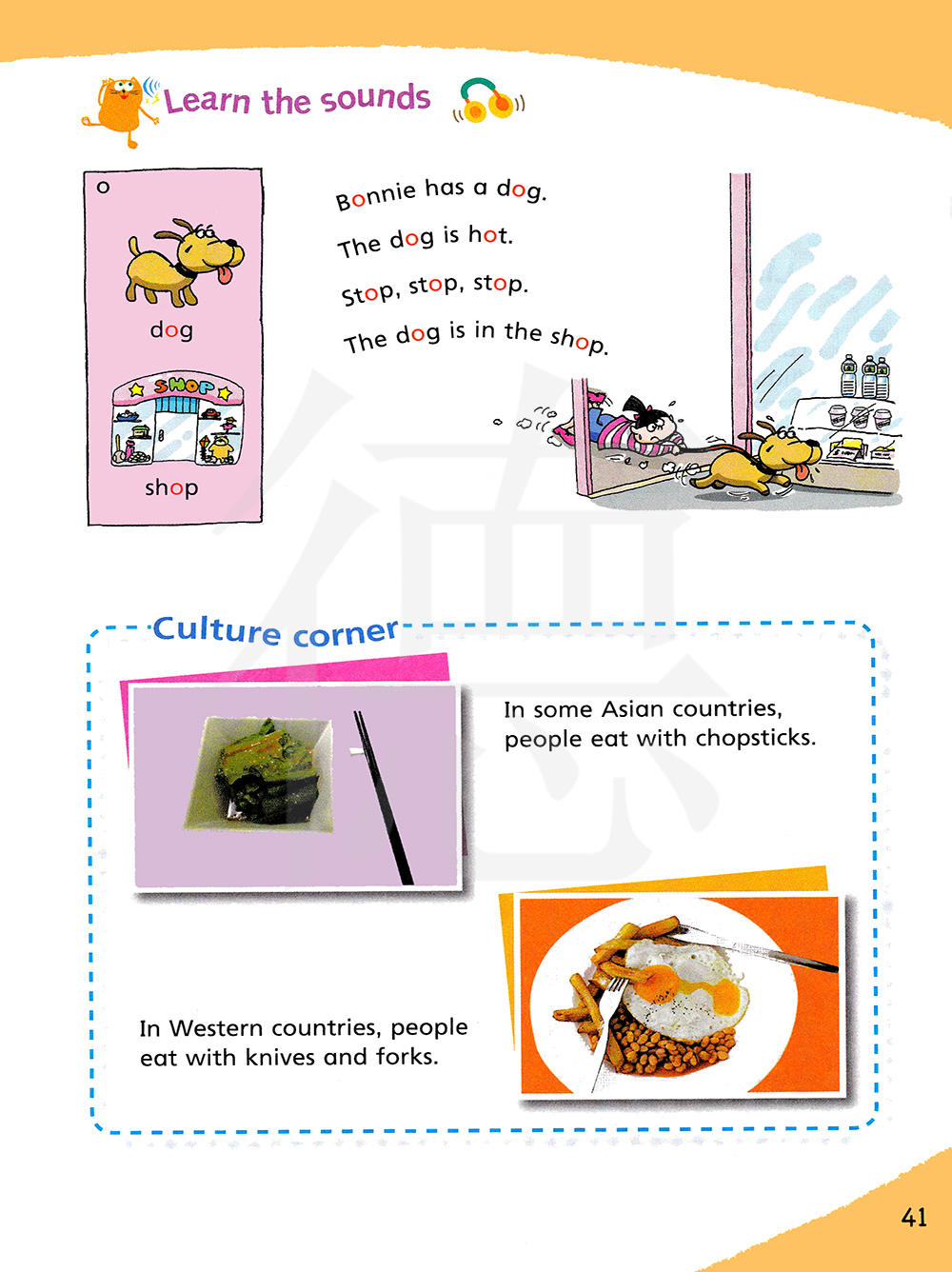 邦妮有一条狗。 狗很热。停,停,停。. 狗在商店里了。