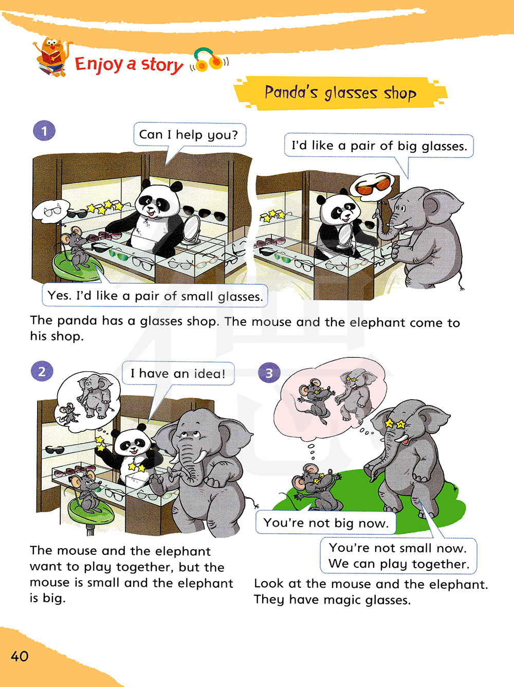熊猫有一家眼镜店,老鼠和大象来到他的店里。