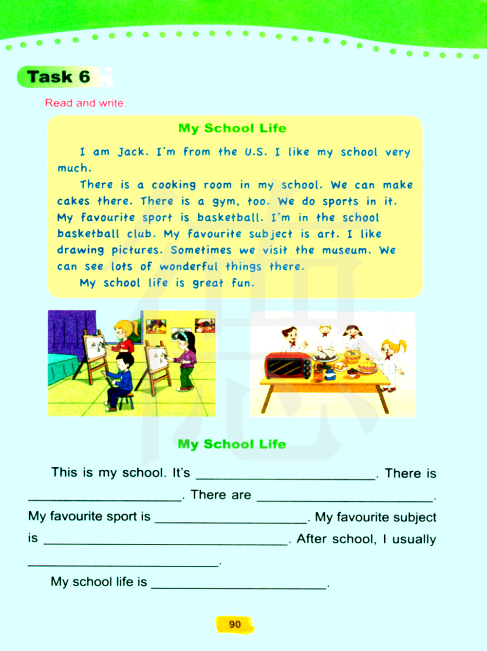 我们学校有一间厨房,我们可以在那里做蛋糕。也有一个体育馆。我们在里面做运动。我最喜欢的运动是打篮球。我加入了学校的篮球俱乐部,我最喜欢的科目是美术,我喜欢画画。有时我们去参观博物馆。我们可以在那里看到很多奇妙的东西。我的学校生活很有趣。