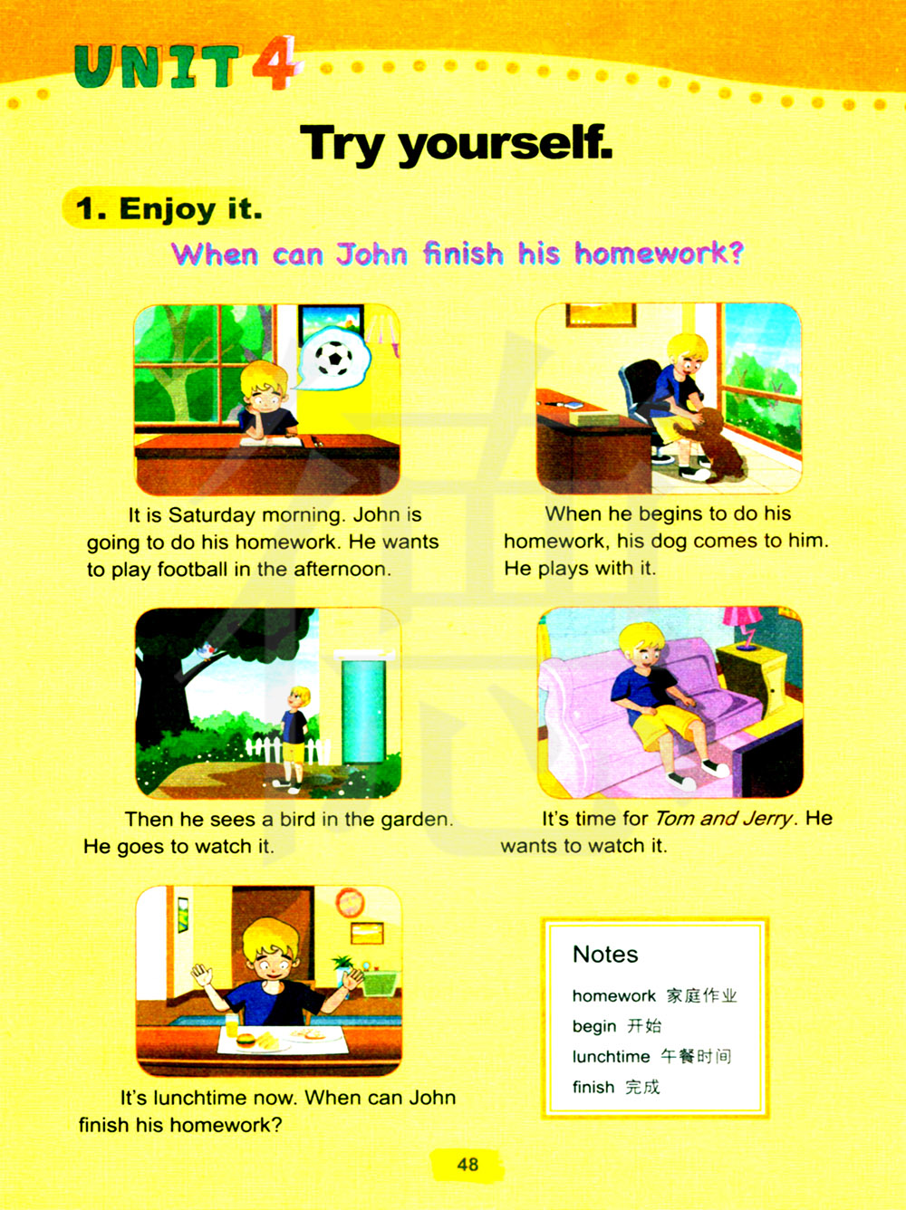 这是星期六的早晨。约翰正准备做作业。他想下午踢足球。