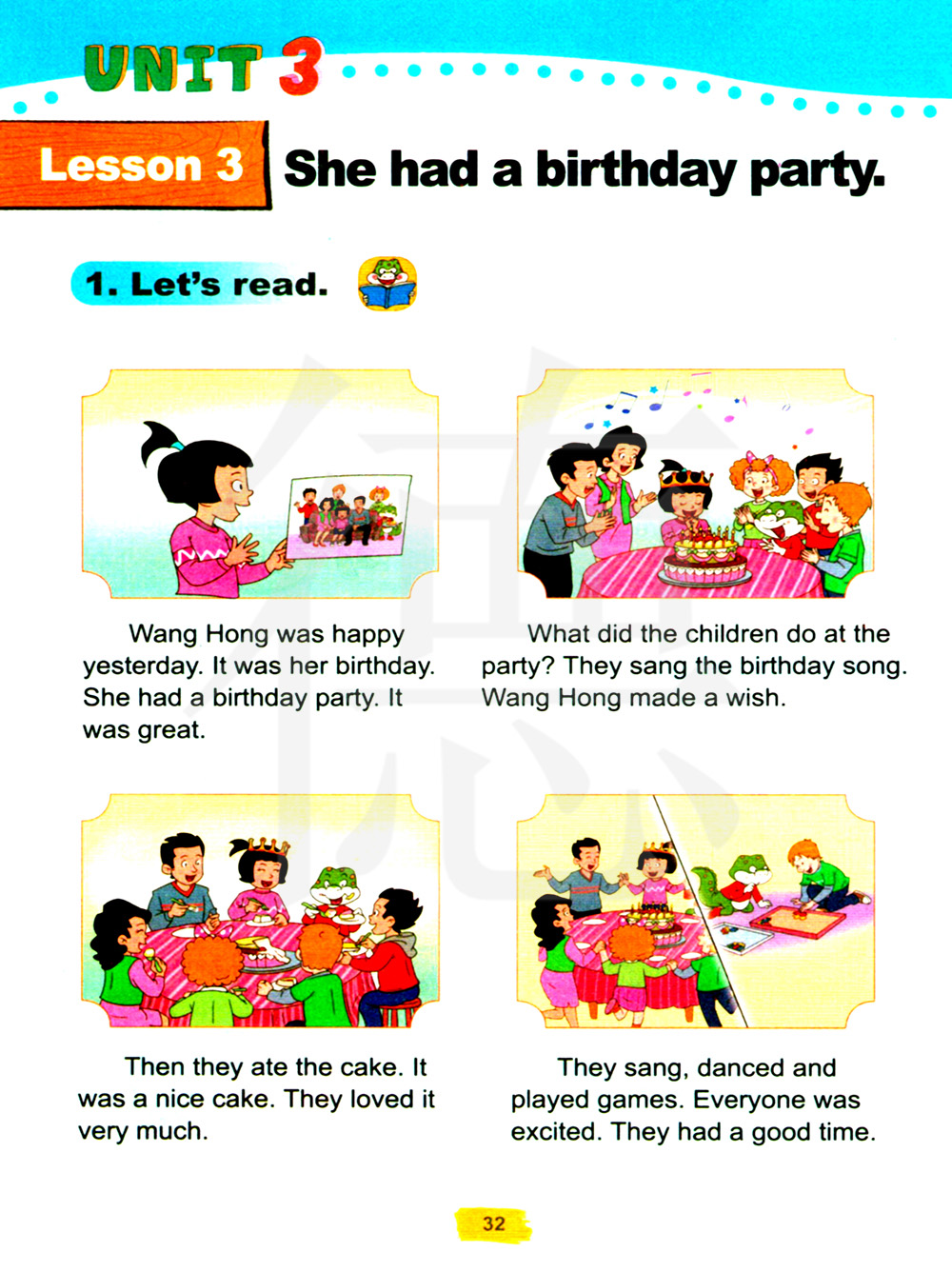 孩子们在派对上做了什么?他们唱了生日歌。王红许了愿。