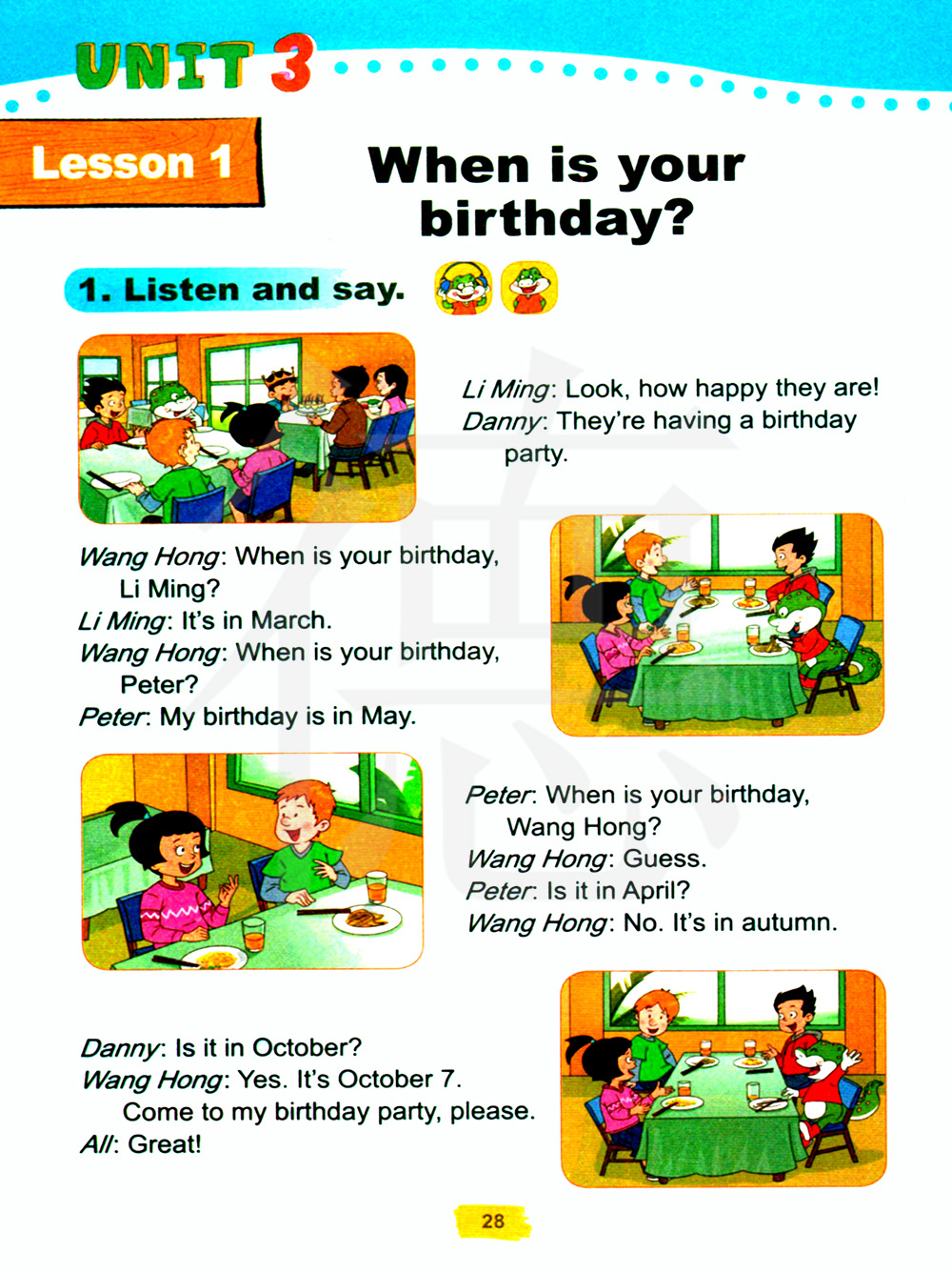 是在十月吗?是的。是在十月七号。请来参加我的生日派对吧。太好啦!