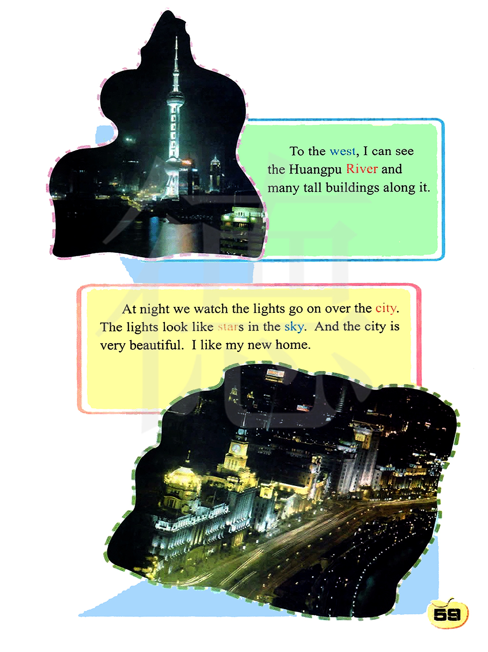 晚上我们可以看到城市的灯光。 灯光看起来像天空中的星星。城市很美。我喜欢我的新家。
