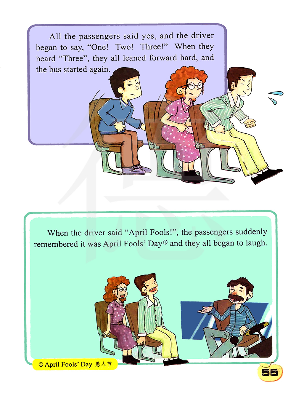 当司机说“愚人节快乐”的时候,乘客们突然意识到今天是愚人节,他们都笑了。