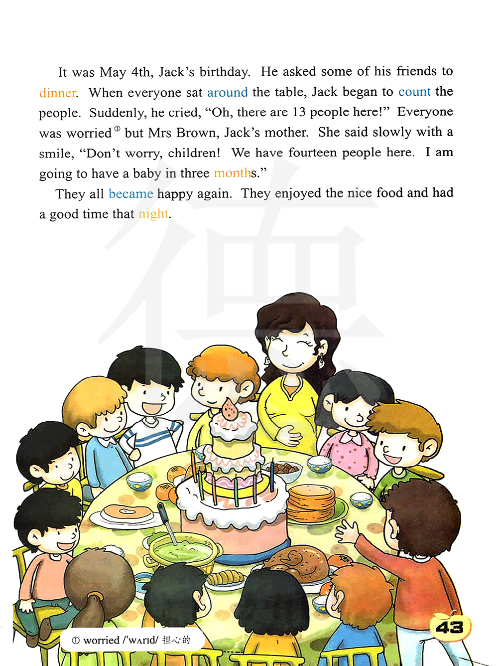 五月四号是杰克的生日。他邀请了一些朋友吃晚餐。 当每个人都围着桌子坐下的时候,杰克开始数人数。突然,他喊道,“哦,这儿有13个人!”每个人都很担心除了布朗夫人,杰克的妈妈。她面带微笑慢慢的说,别担心,孩子们!我们这儿有十四个人。我在三个月后要生下一个宝宝