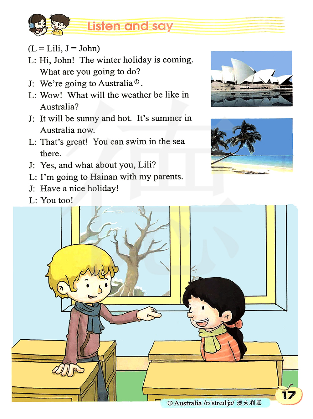 嗨,约翰!寒假就快来了。你打算做什么? 我们将要去澳大利亚。