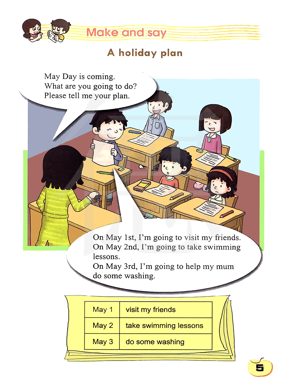 5月1号,我要去拜访我的朋友。5月2号,我要去上游泳课。5月3号,我要帮妈妈洗碗。