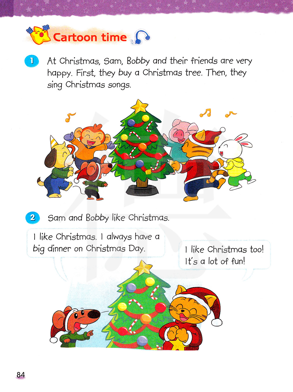在圣诞节,萨姆,波比和他们的朋友们非常开心。首先,他们买了一棵圣诞树。然后他们唱了圣诞歌。
