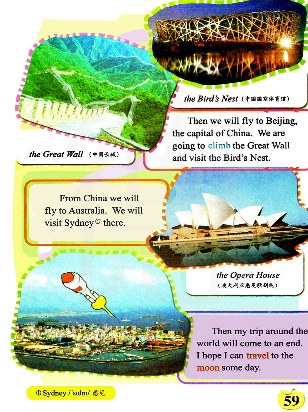 我们将从中国飞往澳大利亚。我们会参观悉尼。
