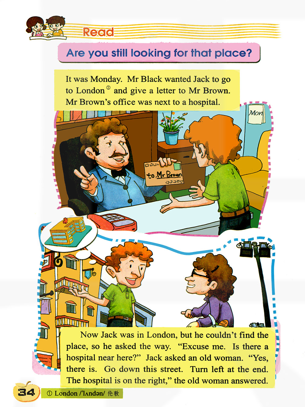 现在杰克在伦敦, 但是他找不到地方,所以他问路。“对不起,打扰一下。这附近有一家医院吗?杰克问了一个老夫人。是的,有的。 沿着这条街往前走。在尽头左转,医院就在右边。”老夫人回答。