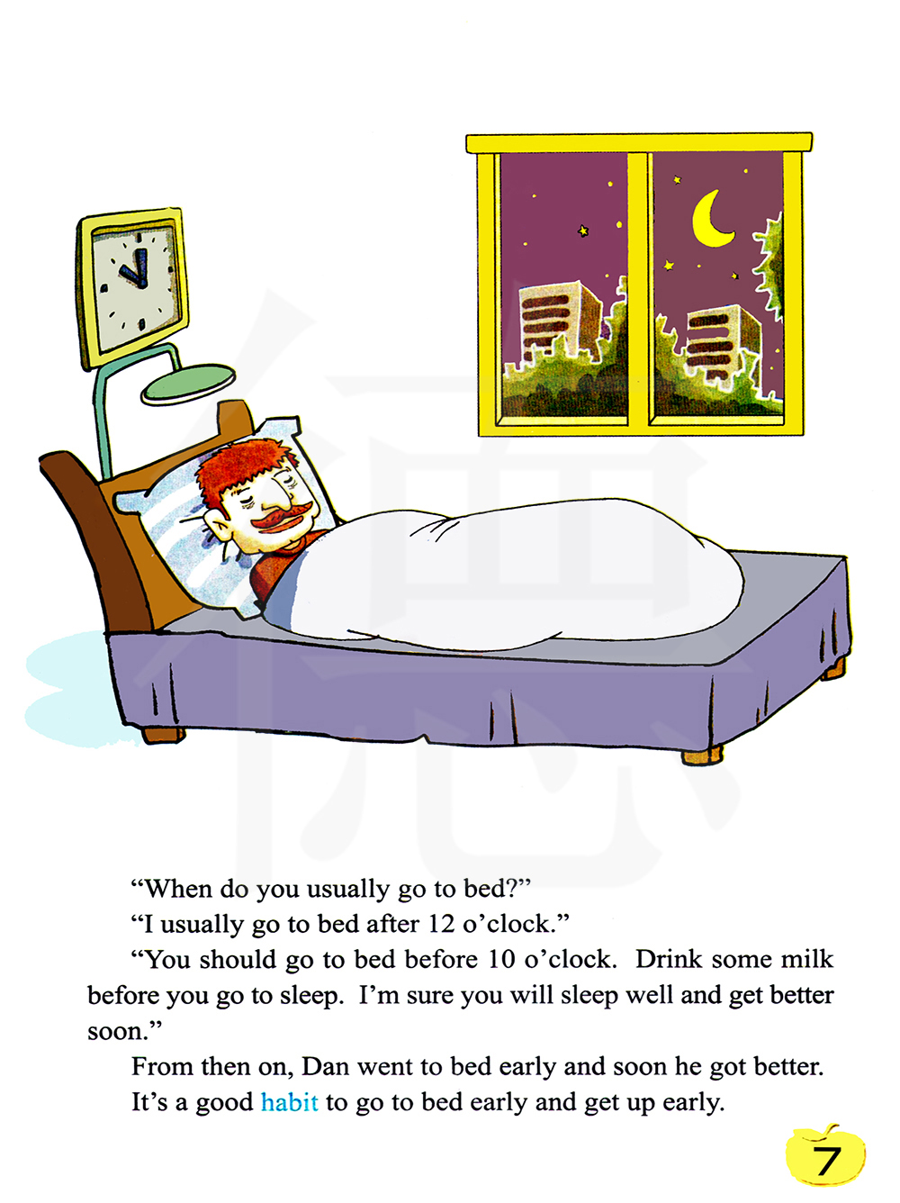 从那时起,丹睡的很早, 很快他就好起来了。 早睡早起是个很好的习惯。