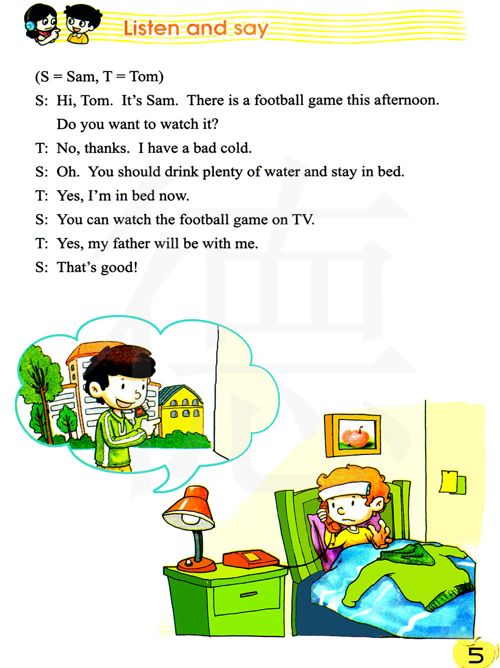 嗨,汤姆。我是山姆。 今天下午有一场足球比赛。 你想看吗? 不,谢谢。