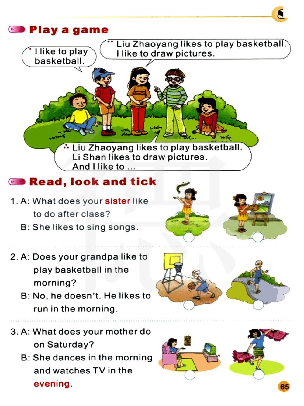 你的爷爷喜欢在早上打篮球吗? 不,他不喜欢。他喜欢在早上跑步。