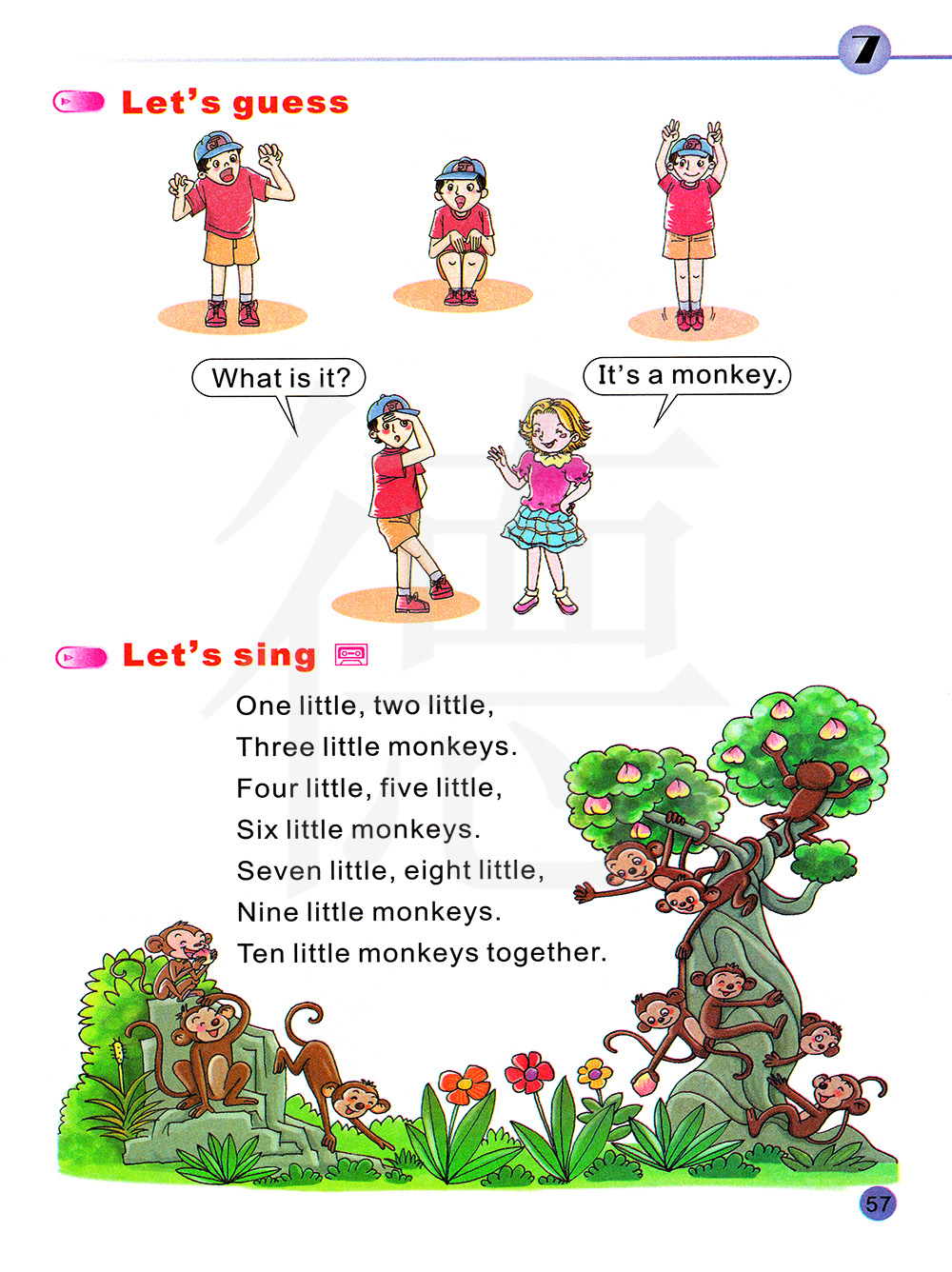 一只小,两只小,三只小猴子。四只小,五只小,六只小猴子。七只小,八两只小,九只小猴子。十只小猴子在一起。