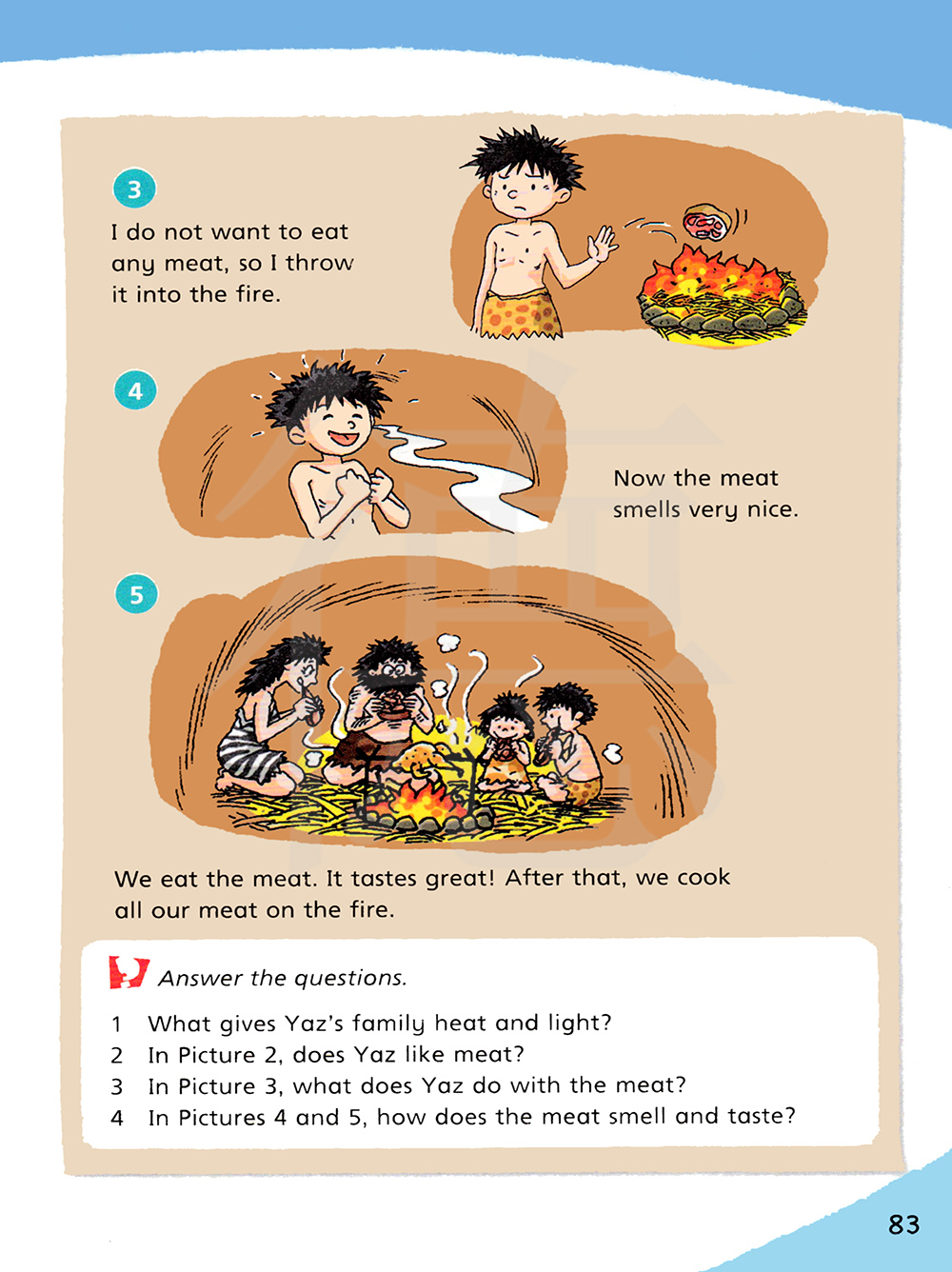 我们吃肉,它尝起来棒极了,从那以后,我们都在火上烹饪我们的肉。