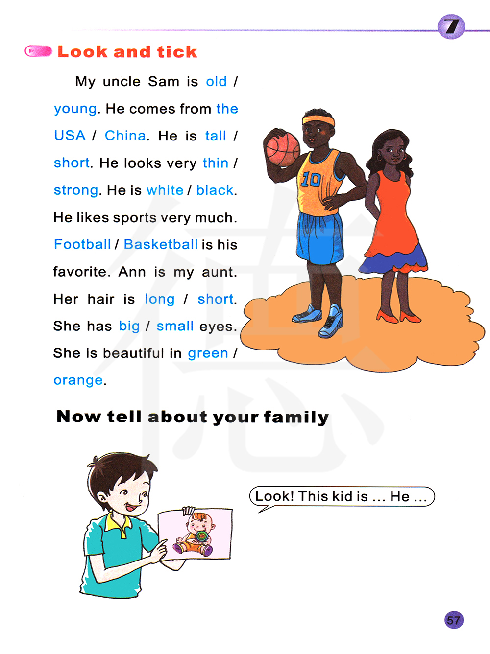 我的叔叔萨姆很年轻,他来自美国,他很高,他看起来非常强壮,他皮肤黑黑,篮球是他的挚爱。安是我的婶婶,她的头发是长的,她有着大眼睛,她穿橙色衣服很漂亮。