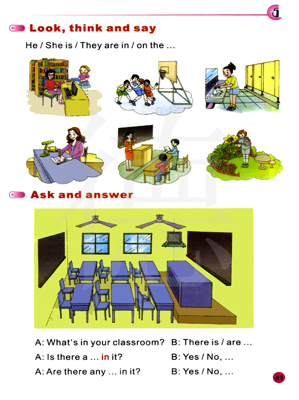 A:你的教室里有什么? B:那里有...... A:那里有一个......吗? B:是的/不,...... A:那里有一些......吗? B:是的/不,......