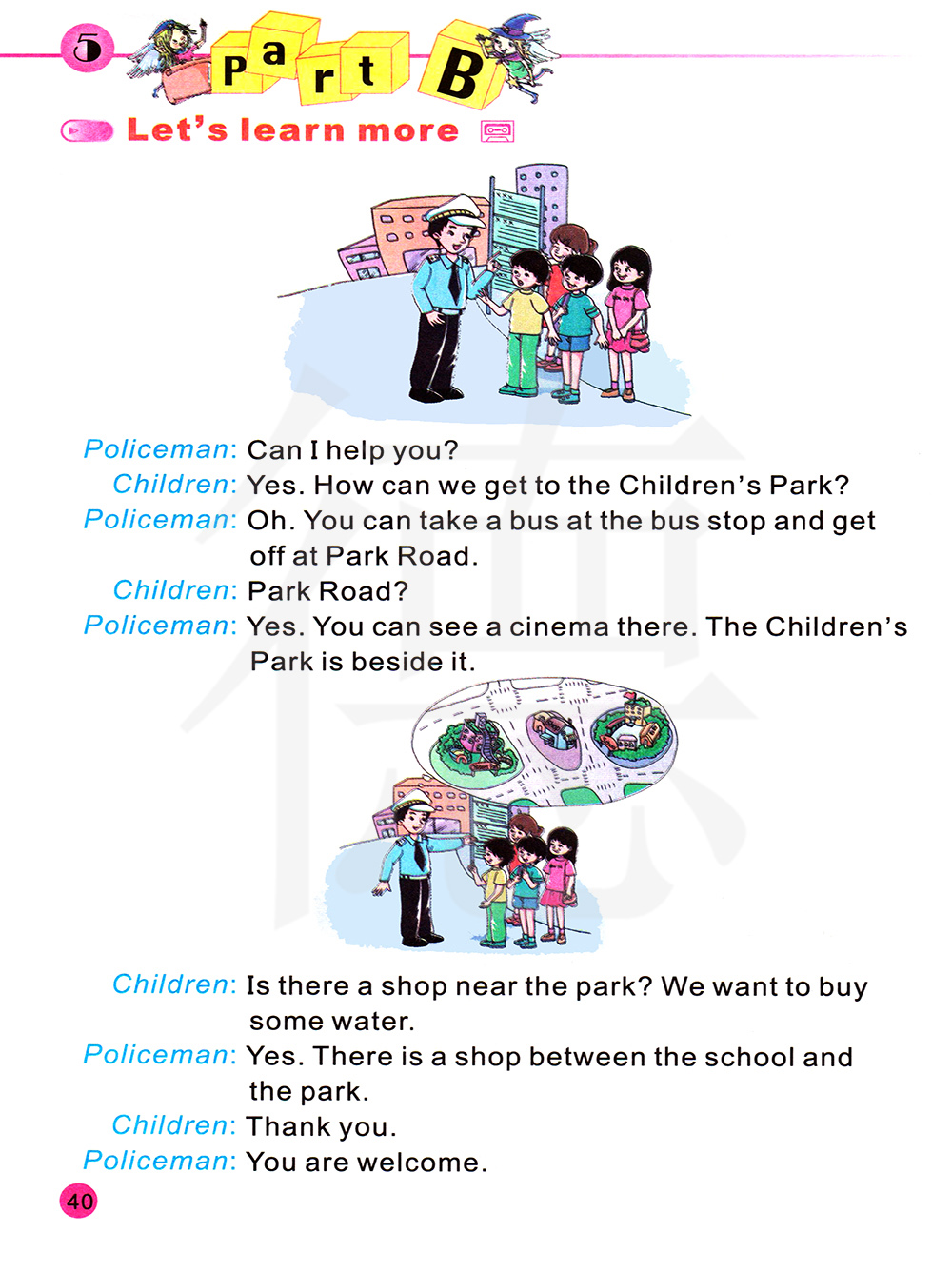 我能帮你吗? 是的。儿童公园怎么走? 哦。你可以在公交车乘公共汽车,