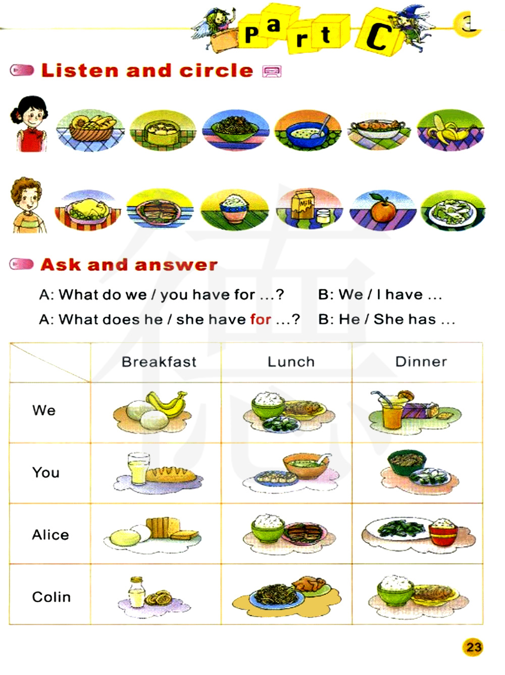 我们/你吃什么......? B:我们吃/我吃...... A:他/她吃什么......? B:他/她吃......