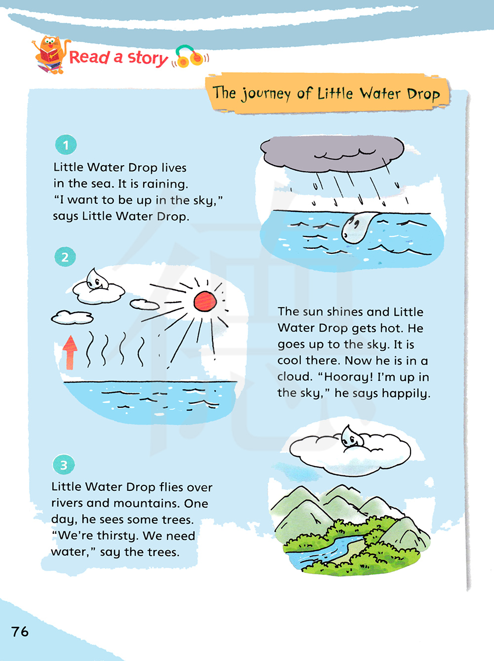 阳光照耀着,小水滴变热了。他升上了天空,那儿很凉爽,现在他在云层里。“万岁!我升到天空上了。”他开心地说。