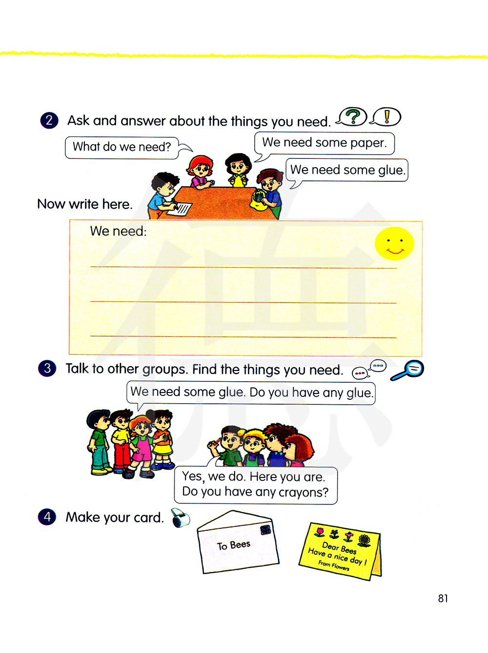和其它组讨论。找到你要的东西。 我们需要一些胶水,你们有胶水吗?