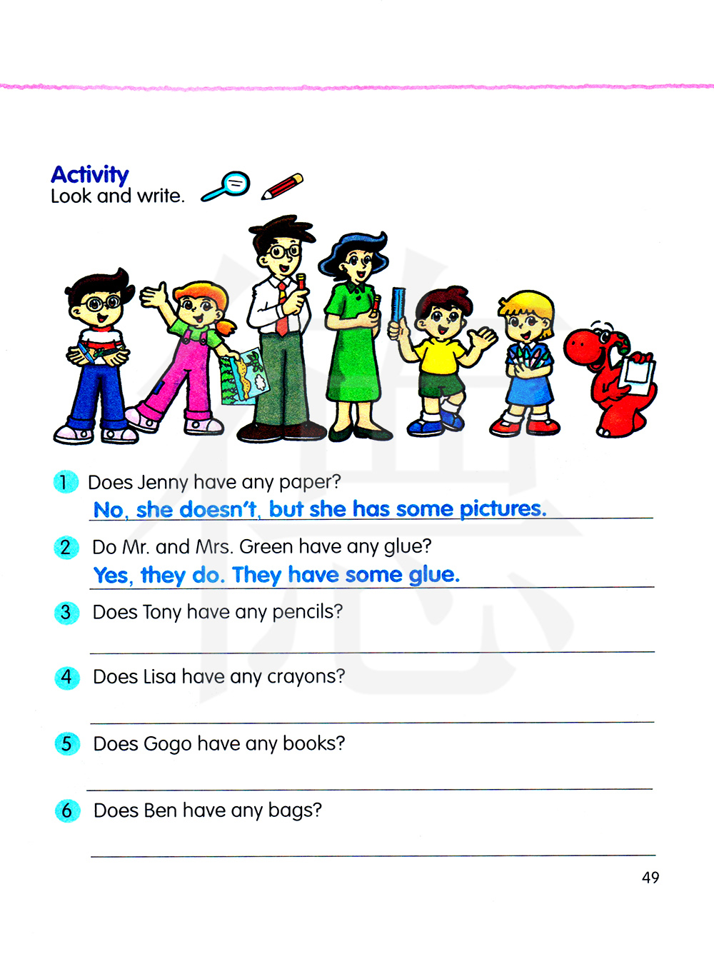 4.丽萨有蜡笔吗? 5.咯咯有书吗? 6.本有书包吗?