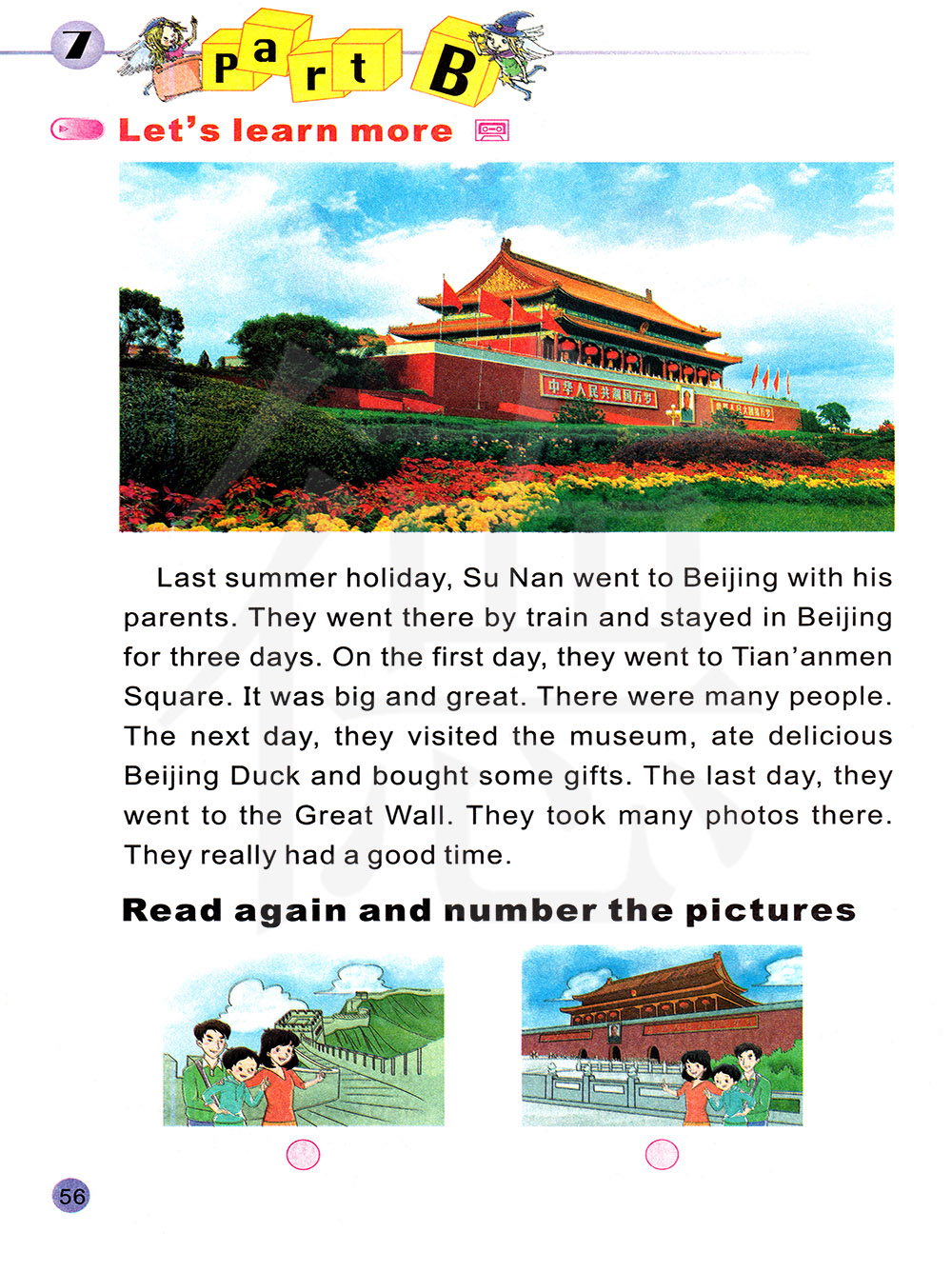 上个暑假,苏南和他的父母去了北京。他们坐火车去的,在北京待了三天。第一天,他们去了天安门广场。它很大很雄伟。那儿有很多的人。第二天,他们去了故宫,吃了美味的北京烤鸭并买了一些礼物。最后一天,他们去了长城。他们在那儿拍了很多照片。他们真得玩得很开心!