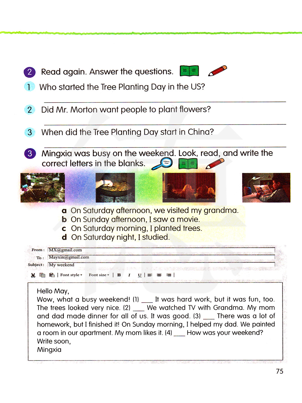 a.星期六的上午,我们看望了我的祖母。b.星期日的下午,我看了一场电影。 c.星期六的早晨,我种树。 d.星期六的晚上,我学习了。