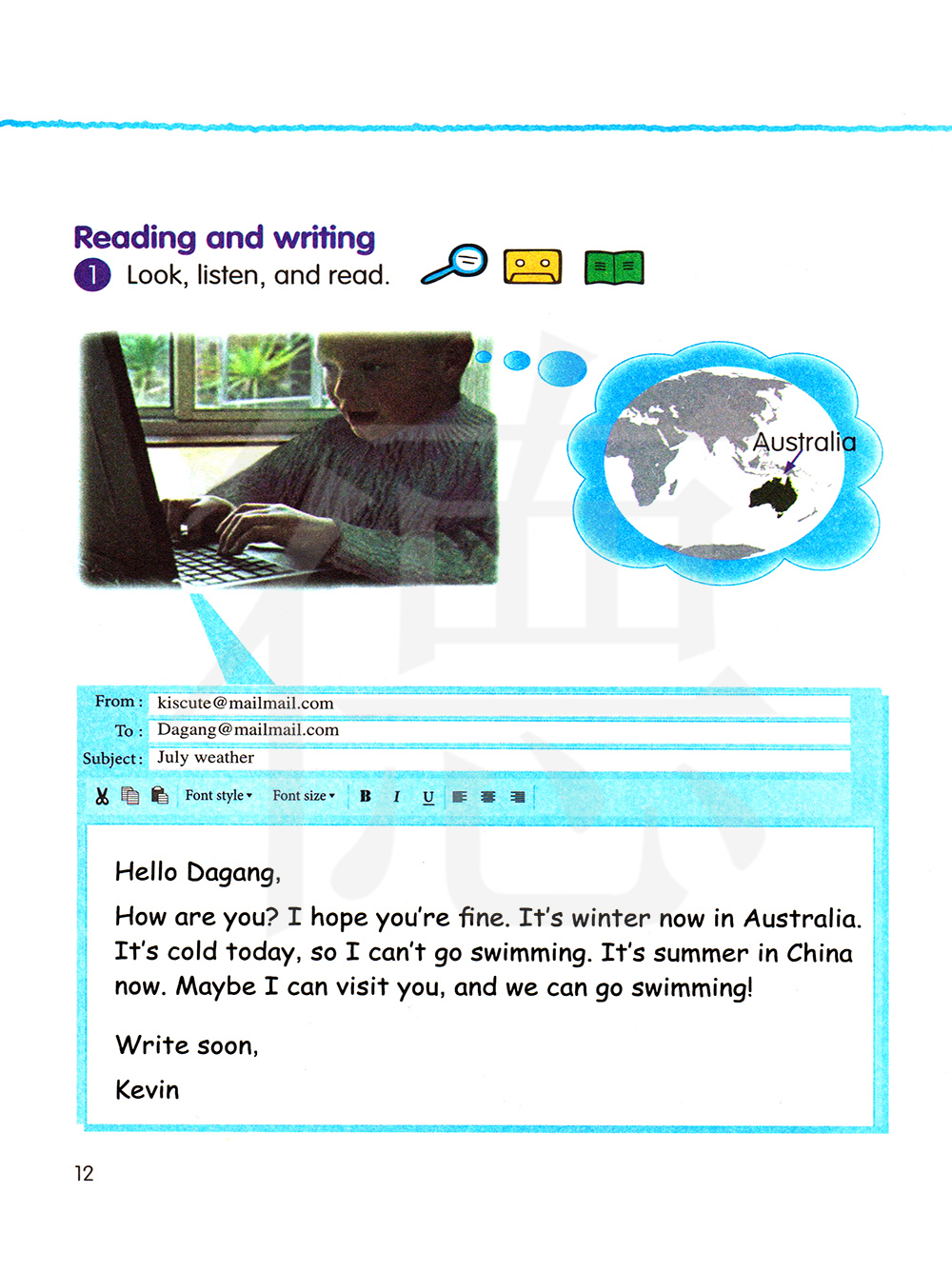 嗨!大刚。 你好吗?我祝愿你很好,澳大利亚现在是冬天。今天很冷,所以我不能去游泳。中国现在是夏天,也许我可以去拜访你,我们可以去游泳。 尽快回复、凯文。
