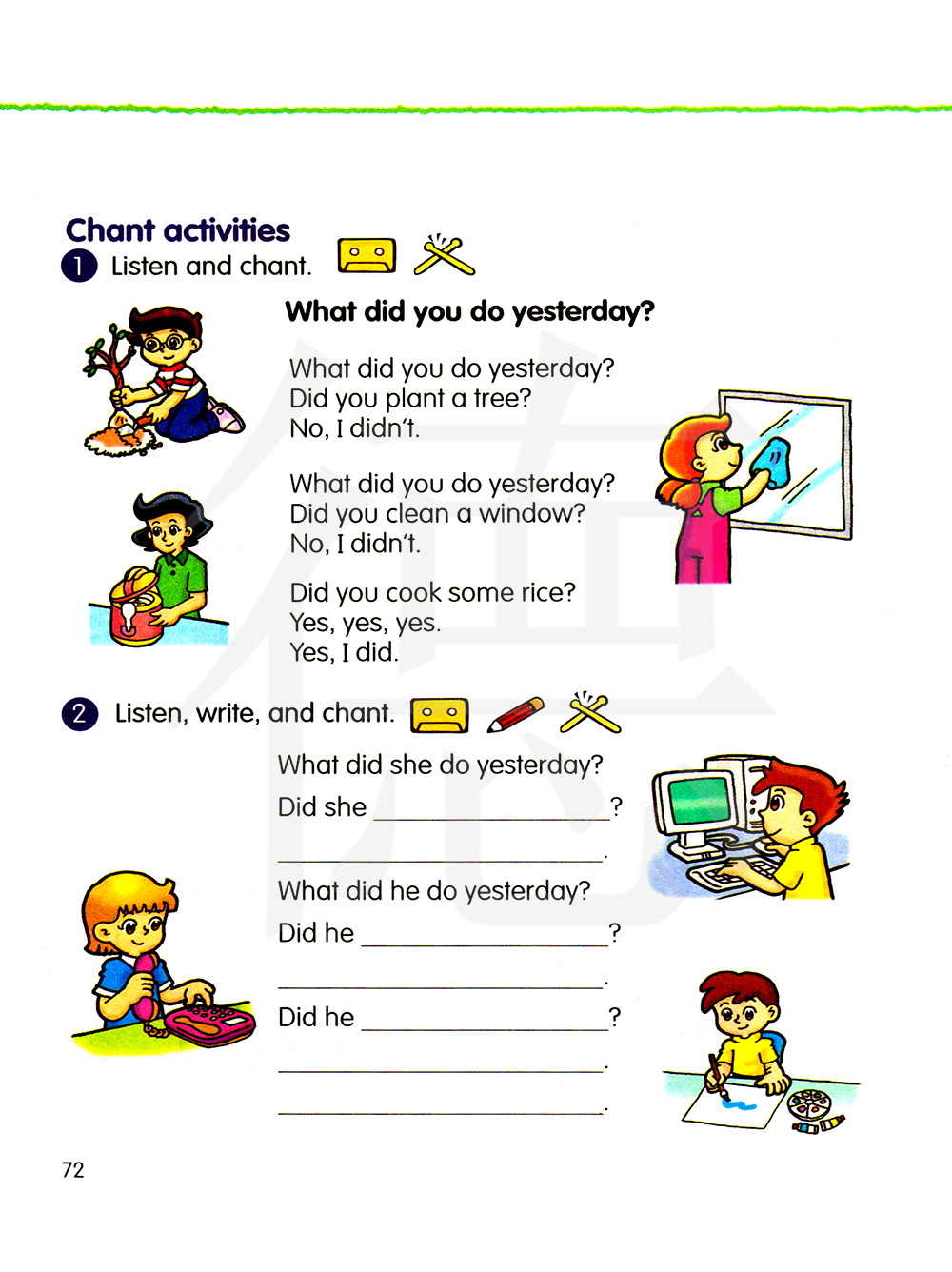 你昨天做了什么?你植树了吗?不,我没有。你昨天做了什么?你擦窗户了吗?不,我没有。你做饭了吗?是的,是的。我做饭了