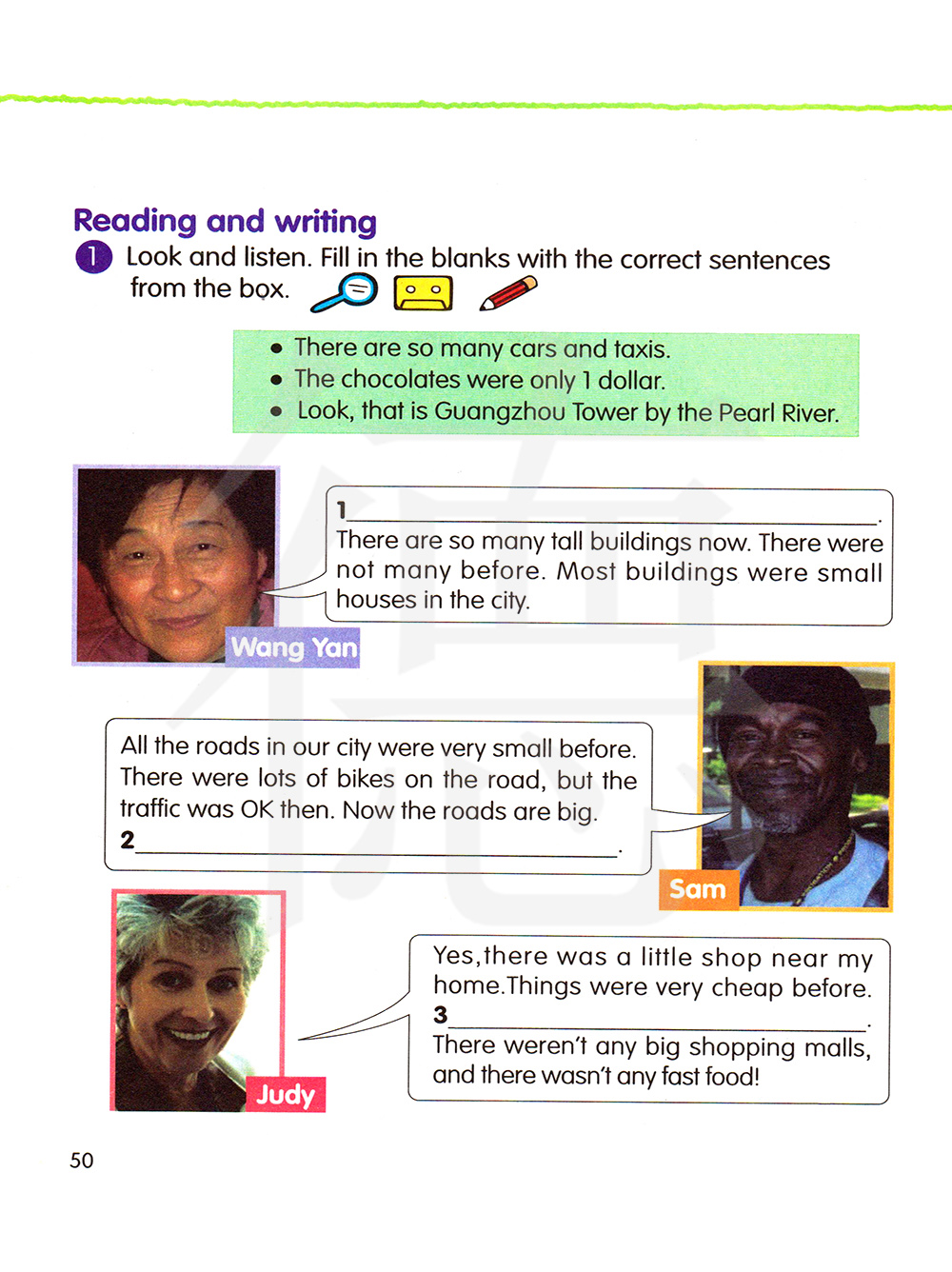 看图并听录音,用方框里的句子填空。
