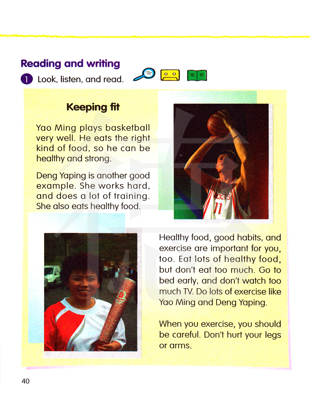 健康食品、好的习惯和锻炼对你也很重要。多吃健康食品,但不要吃太多。早点睡觉,不要看太多电视。多运动,像姚明和邓亚萍那样。