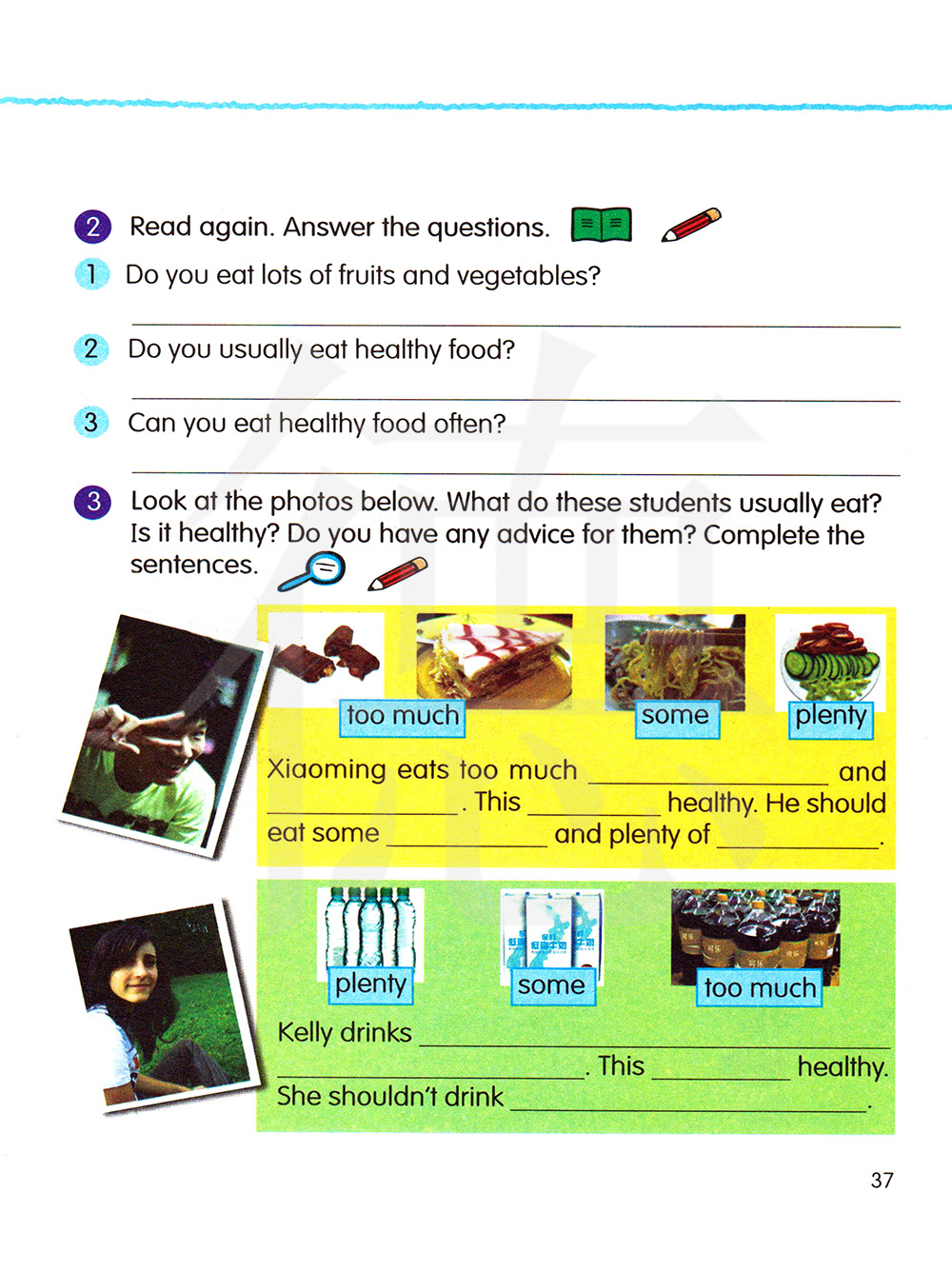 3.看下面的图片。这些学生通常吃什么?这健康吗?你对他们有什么建议吗?完成句子。
