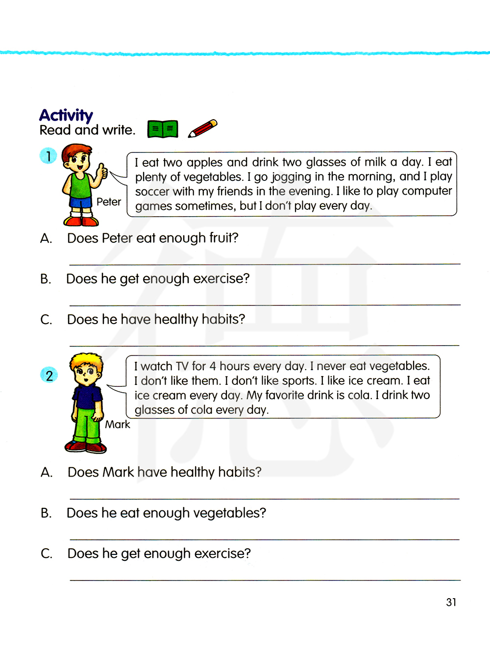 我每天吃两个苹果,喝两杯牛奶。我吃很多蔬菜。我早上去慢跑,傍晚和朋友去踢足球,我有时玩电脑游戏,但我不是每天玩