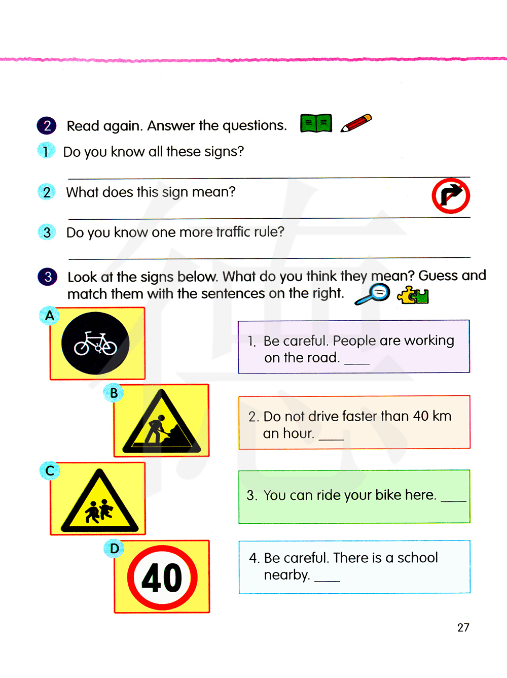 3.看下面这些标志,看它们是什么意思,猜一猜,并把它们和右边的这些句子连起来