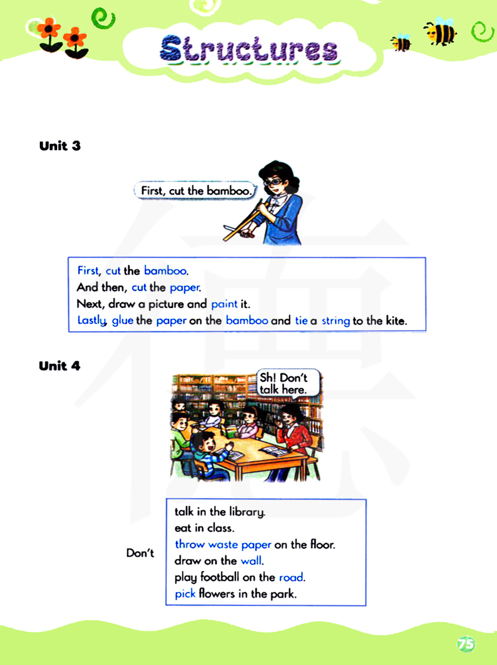 不要在图书馆里说话/在课堂上吃东西/把废纸丢在地板上/在墙上涂画/在马路上踢足球/在公园里摘花。