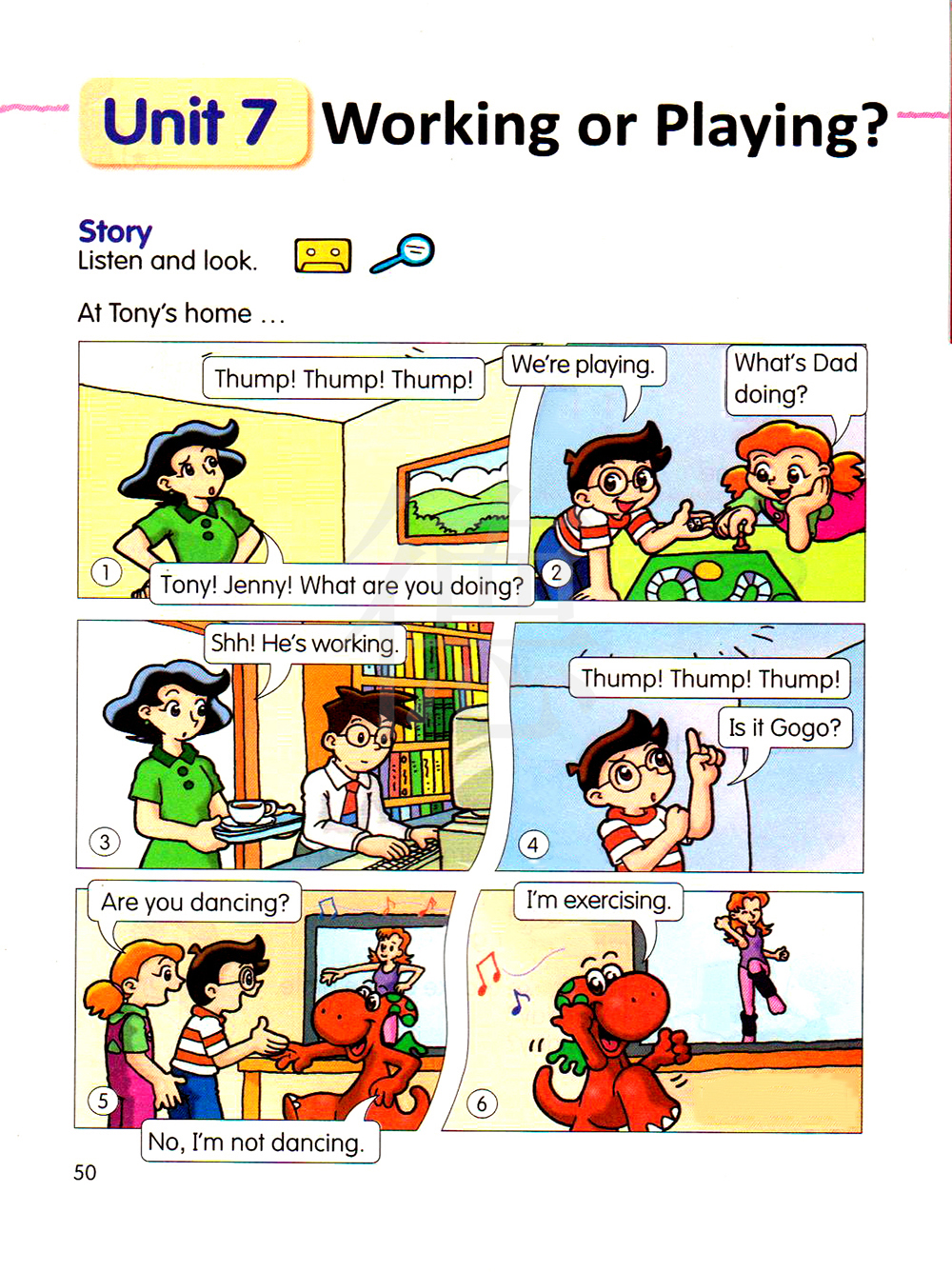 1.work/working 工作 2.talk/talking 谈话 3.shout/shouting喊叫 4.color/coloring