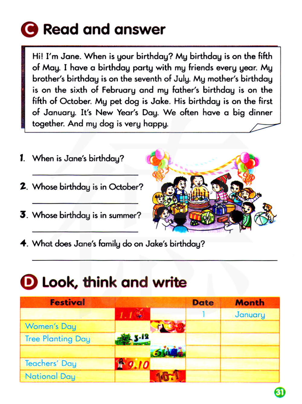 3.谁的生日在夏天? 4.简的一家在杰克的生日时做什么?