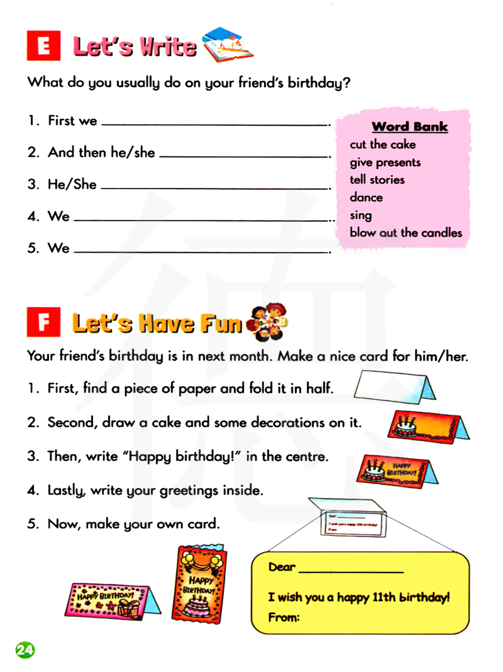 3.然后,在中间写上生日快乐。 4.最后,在里面写上你的问候。 5.现在,做一做你自己的贺卡