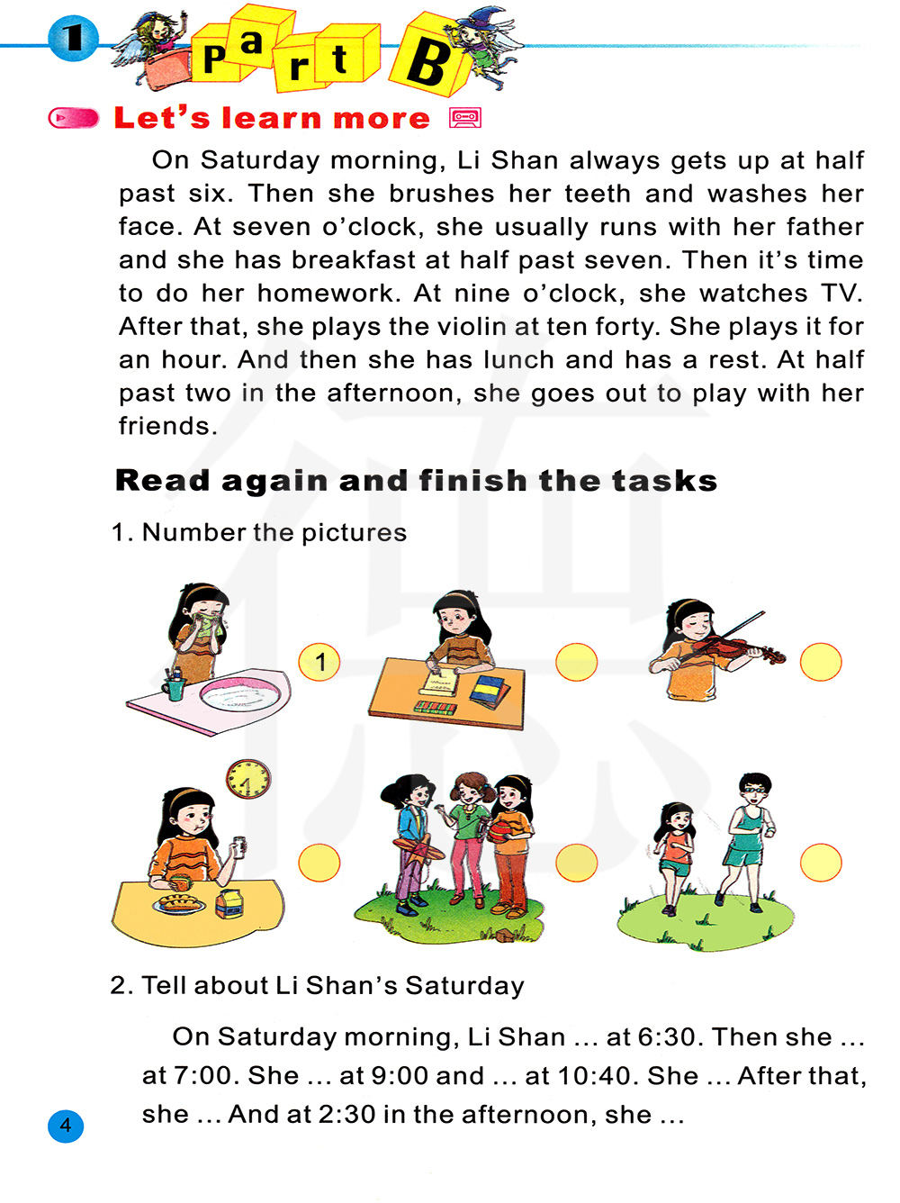 星期六早上,李珊总是在六点半起床。然后她刷牙洗脸。七点钟时,她通常跟她的爸爸出去跑步。她七点半吃早饭。然后就到了做作业的时间了。九点钟,她看看电视。之后,十点四十开始拉小提琴。她要练一个小时。然后吃午饭,休息一会儿。下午两点半,她出去和她的朋友们玩儿。